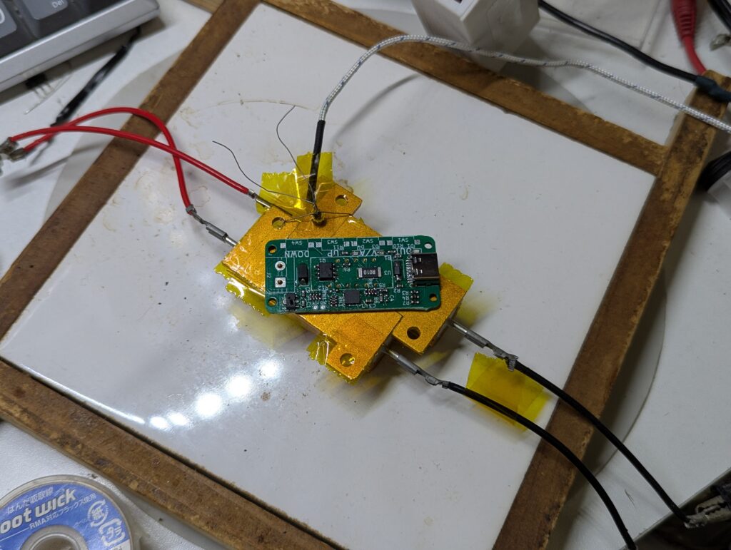 基板を置いた時に邪魔にならないような場所にポリイミドテープで止めました。高温時にテープだけでは外れてしまったので、上から針金で押さえました。デジタルマルチメータでデジタル値に変換しています。