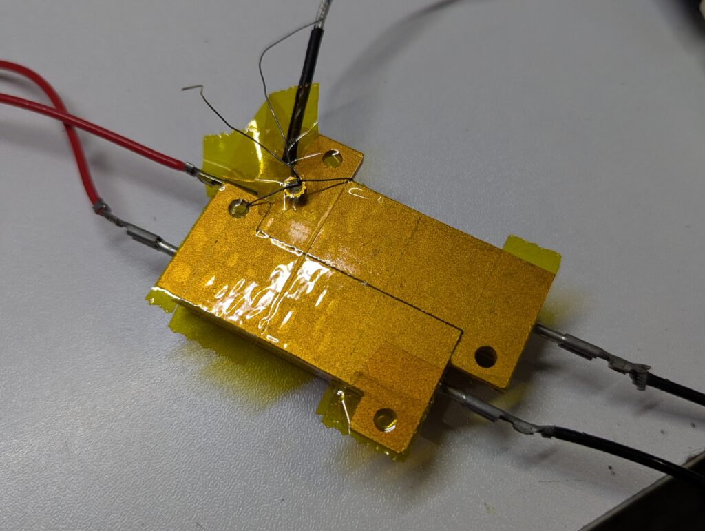 家に余ってたので使いました。ネジで止めるための耳があるので、ちょっとズラしてポリイミドテープで止めました。直列に繋いで、電源は30V3Aにしました。90Wです。配線はハンダだと溶ける可能性があったので、圧着端子を使用しました。メタルクラッド抵抗はセラミックのタイルの上に配置しました。