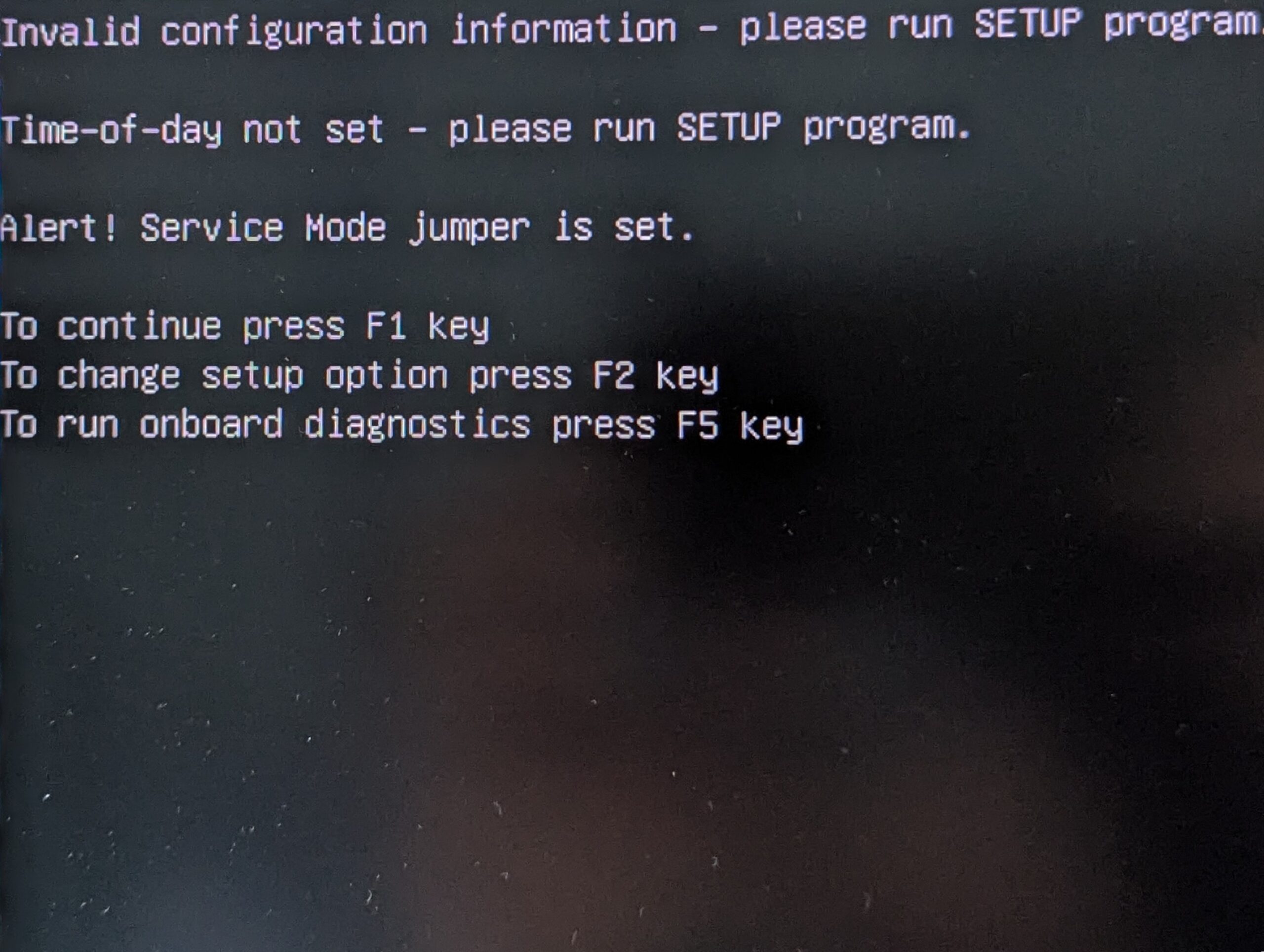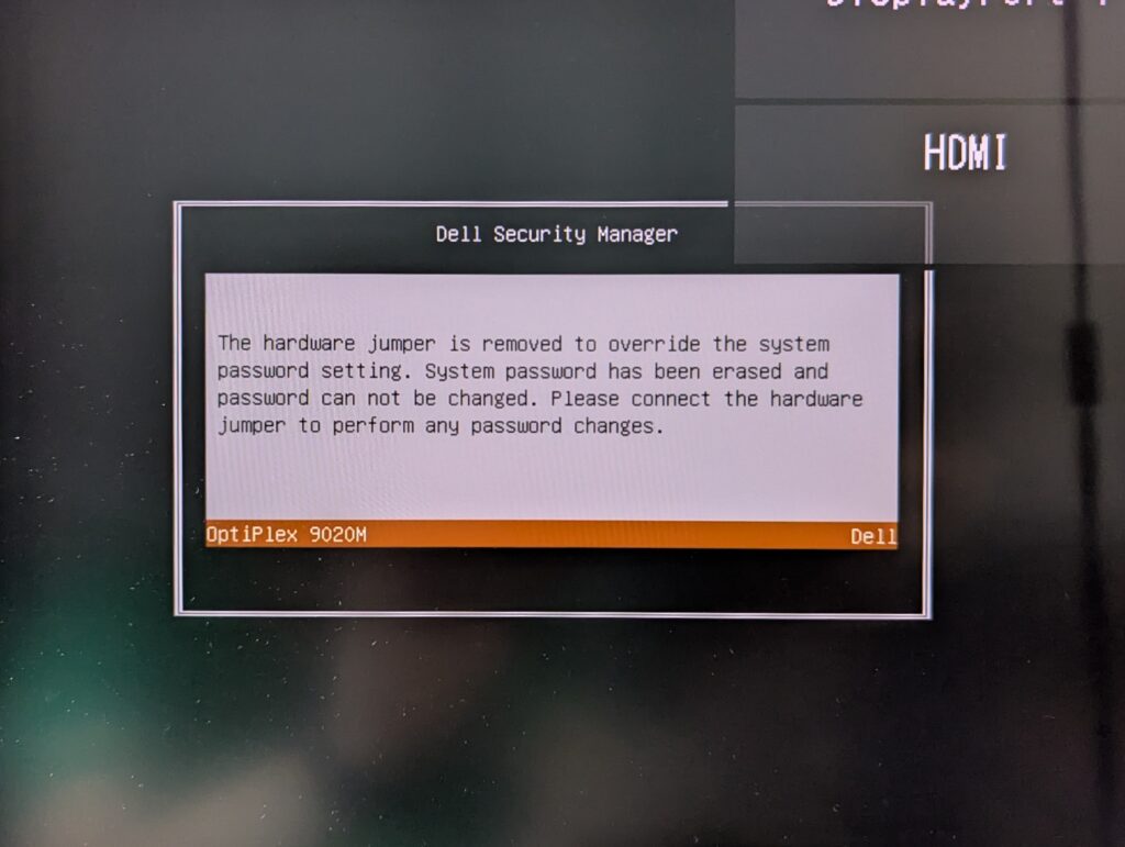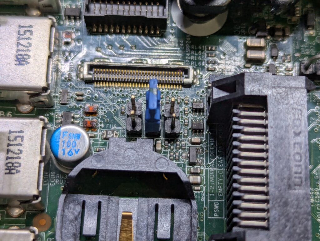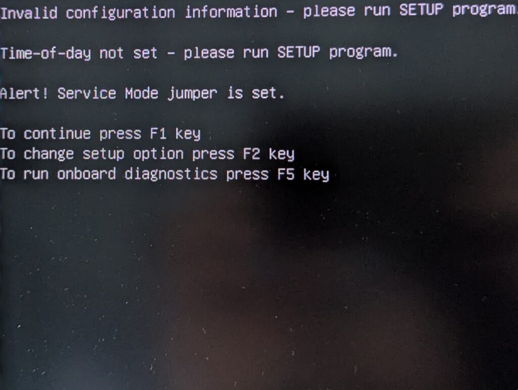 電源を切った状態でジャンパーピンの接続を変えます。PSWDのところをジャンパを中央のSERVICE_MODEのところに差し替えます。この状態で起動すると、パスワードがリセットされるという警告文と、サービスモードであることの警告文が表示されます。そのままF1を押してWindowsを起動させます。